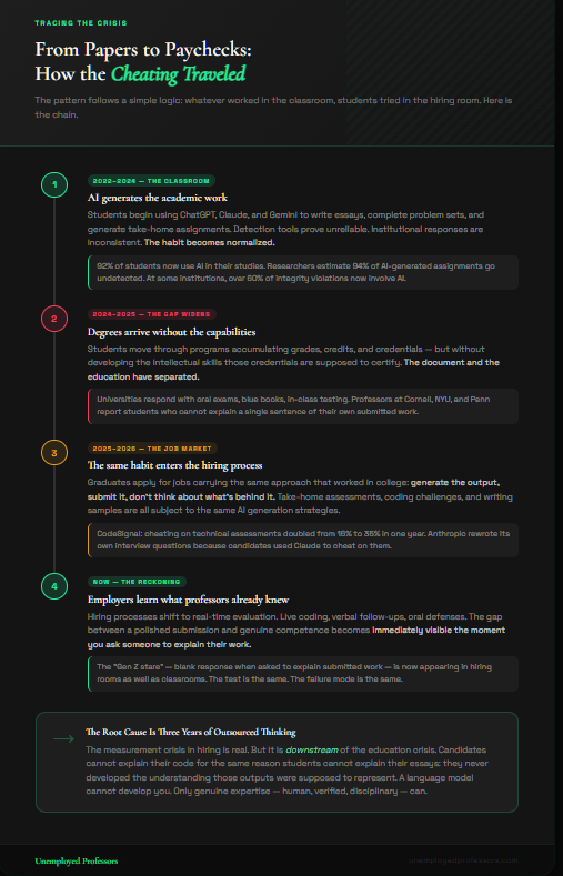 The reason technical interview questions need to be redesigned is not just that AI can generate code. It is that a growing number of candidates cannot explain the code they submit — because they did not write it and do not understand it. The cheating crisis in hiring is downstream of the cheating crisis in education. Candidates are using AI in interviews for the same reason students could not explain their essays in office hours: they have learned to produce outputs without developing the understanding that those outputs are supposed to represent.
