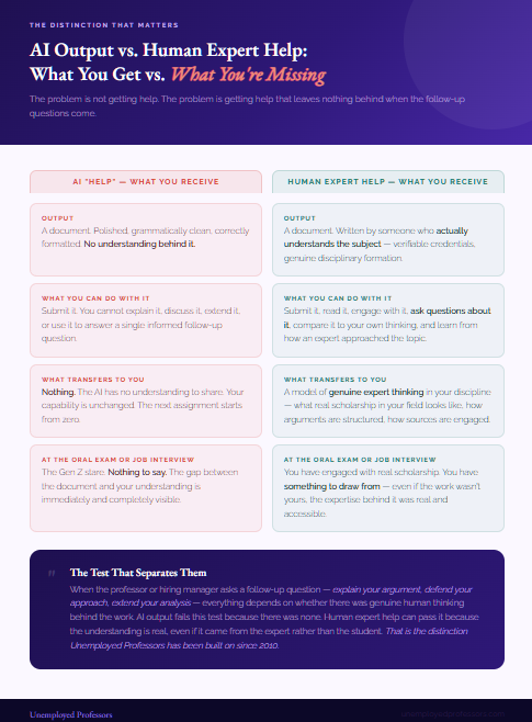 Students who built their academic records on genuine human expertise — whether their own, developed through real engagement with the material, or that of a genuine subject-matter expert whose work they could learn from — are the ones who will have something to say when the follow-up questions come.